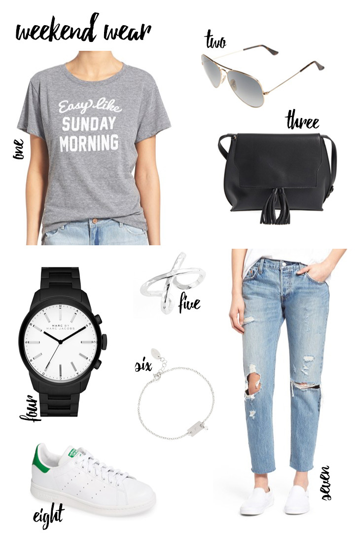Happy Friday! I thought I’d put together one of my favorite weekend looks since I am trying to save on style posts… the rain ruined a shoot this week. I am currently coveting ALL items on this list here… especially this tee. It’s super casual and I love the vibe (also less than $40). These jeans are the ones I posted yesterday and they’ve been on major repeat. Super comfortable. This watch is currently 40% off right now… super deal! Xoxo, have a happy weekend! **Hover over photo and number to visit each link.